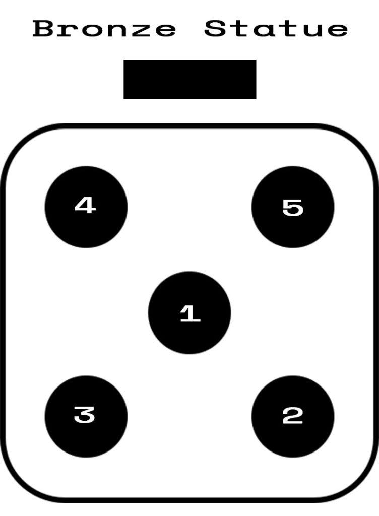 Dann geht es zur Position 2 und Position 3, die am weitesten von unserer Statue entfernt sind. Geht so weit rechts und links, dass Ihr in etwa in 90° auf das Motiv schaut. Gleiches gilt dann für die Punkte 4 & 5, die sehr nah an unserem Objekt liegen. Diese beiden letzten Punkte hängen von Eurem Objektiv ab. Je weinwinkliger die Linse, desto näher kommt Ihr an die Bronze Figur. Bei den Punkten 4 & 5 geht Ihr leicht in die Froschperspektive. Durch diese 5 Perspektiven bekommt Ihr einen ersten guten Eindruck von Euren Möglichkeiten. Danach entscheidet Ihr Euch in welche Richtung Ihr das Motiv fotografieren wollt. Vielleicht ist die beste Perspektive zwischen 5 & 2 oder Position 1 von unten.